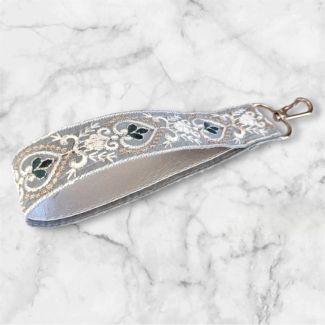 バッグやお財布、スマートフォンなどに付けていただけるので、毎日のお出かけに活躍すること思います。 自分用としても、大切な方へのギフトとしても喜ばれること間違いなし!個性的なデザインで、見るたびにハッピーな気持ちにさせてくれます。 こちらの商品は、手作業で丁寧に仕上げたハンドメイド作品です。 ハンドメイドにご理解下されば幸いです。 【サイズ】幅32mm (画像をご参照ください) 腕を通せるサイズになっております。 【素 材】インド刺繍リボン 裏側は合皮素材テープになります 【お 色】ブルー系(グレーに近いお色です) 他の色(ブラック系・ピンク系・パープル系)もございます。 ハンドメイドの特性上、若干のサイズ誤差が生じる場合がございますので、予めご了承ください。