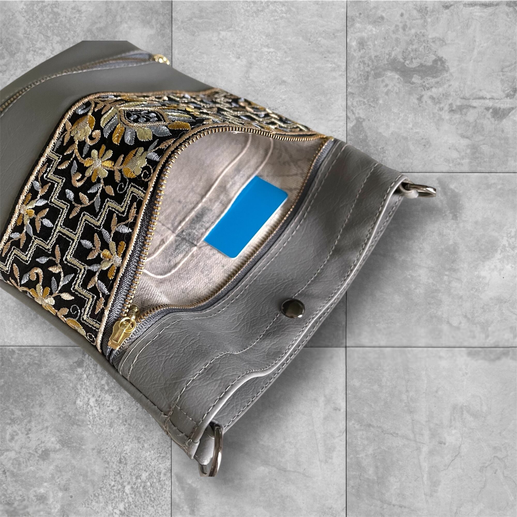 フェイクレザー素材にインド刺繍リボンを施し、とてもオシャレに仕上がったと思います。